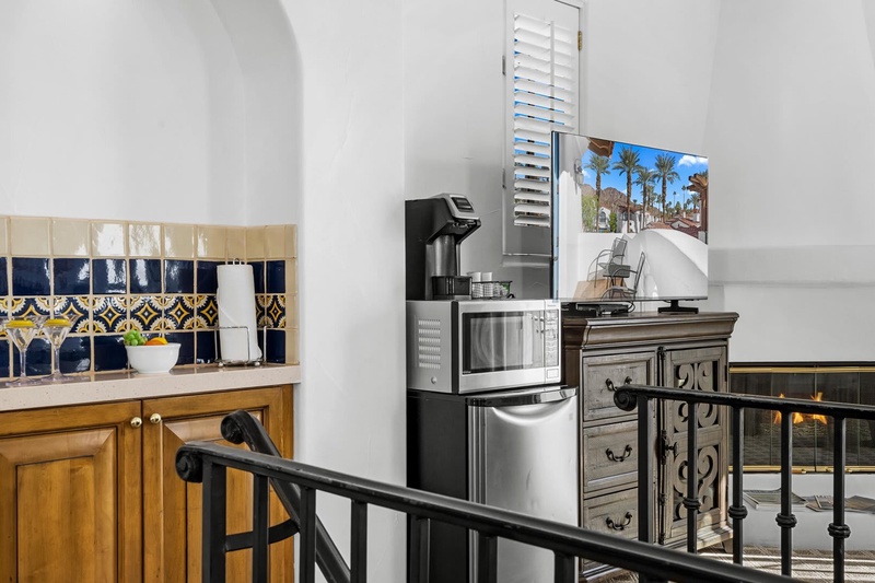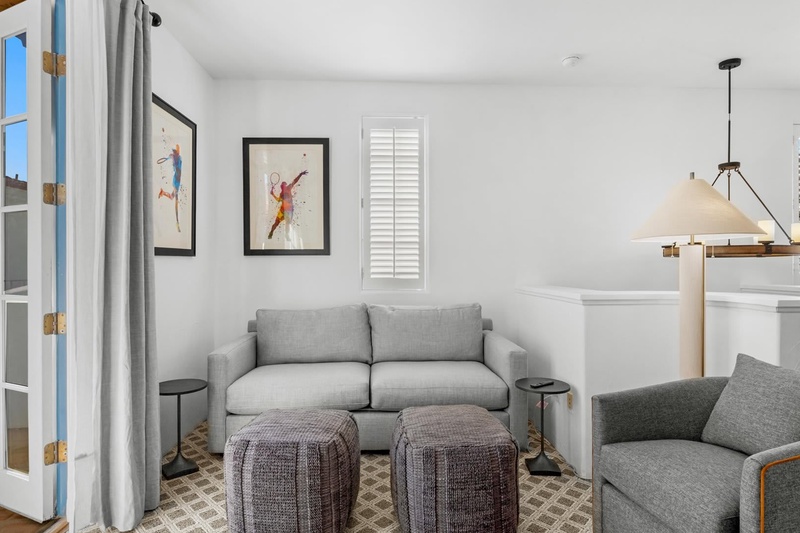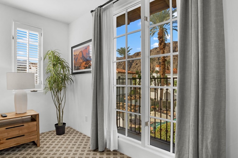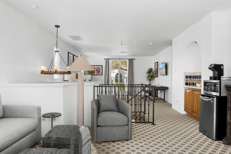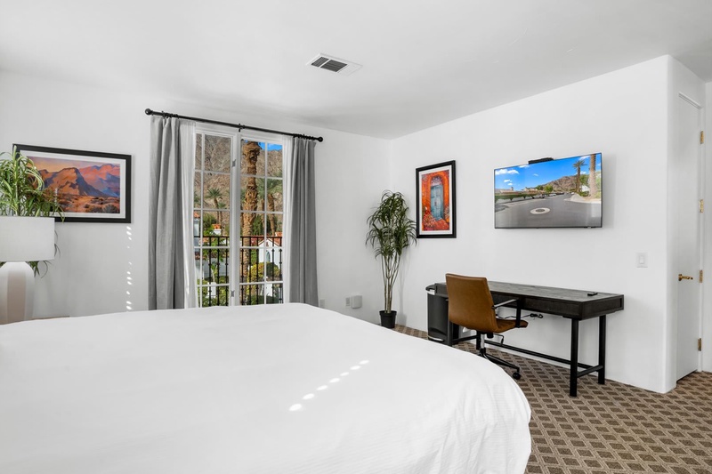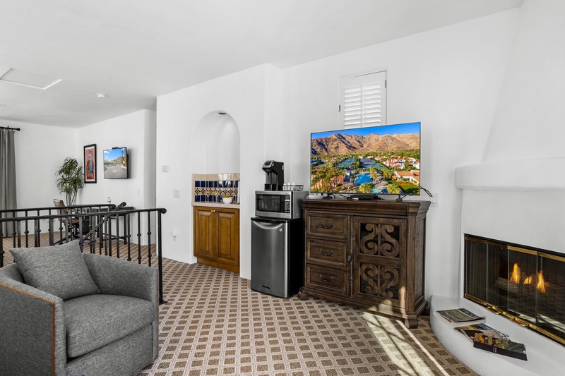 Discover a freshly updated upstairs Spa Villa studio featuring new carpet, fresh paint, and stylish Crate & Barrel furnishings. This bright retreat offers a plush king bed, full bathroom, cozy living area, and a private balcony perfect for relaxing. Enjoy modern comforts including multiple TVs and a mini-fridge/microwave combo—an ideal escape for a relaxing La Quinta getawa...